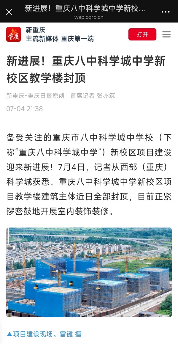 重庆日报——新进展!重庆八中科学城中学新校区教学楼封顶