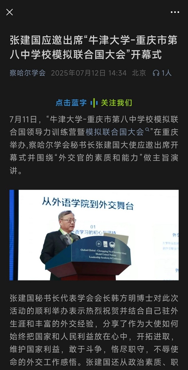 察哈尔学会——张建国应邀出席“牛津大学-重庆市第八中学校模拟联合国大会”开幕式