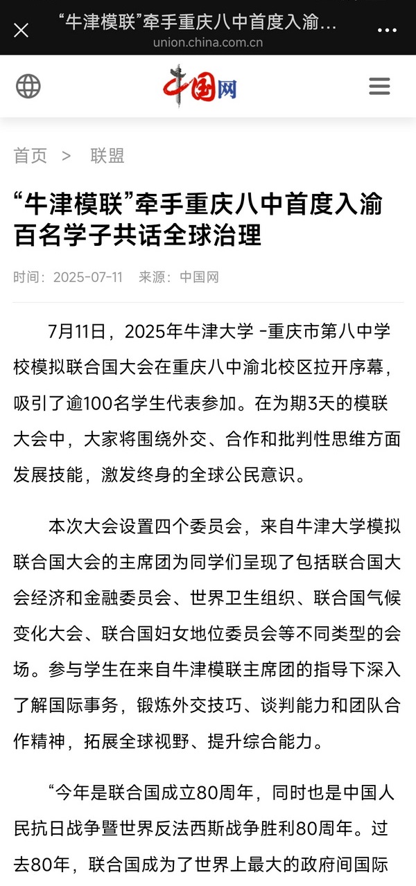7月11日,2025年牛津大学 -重庆市第八中学校模拟联合国大会在重庆八中渝北校区拉开序幕,吸引了逾100名学生代表参加。在为期3天的模联大会中,大家将围绕外交、合作和批判性思维方面发展技能,激发终身的全球公民意识。