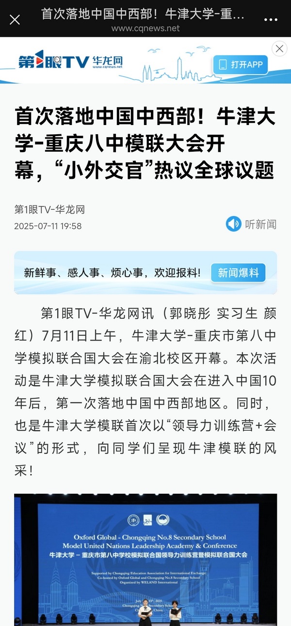 第1眼tv-华龙网讯(郭晓彤 实习生 颜红)7月11日上午,牛津大学-重庆市第八中学模拟联合国大会在渝北校区开幕。本次活动是牛津大学模拟联合国大会在进入中国10年后,第一次落地中国中西部地区。同时,也是牛津大学模联首次以“领导力训练营 会议”的形式,向同学们呈现牛津模联的风采!