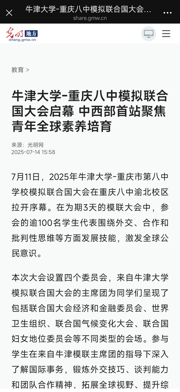 光明网——牛津大学-重庆八中模拟联合国大会启幕 中西部首站聚焦青年全球素养培育