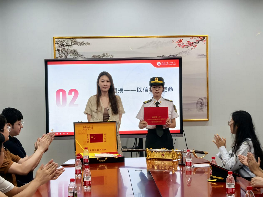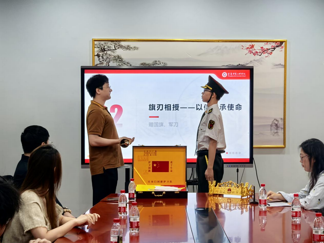 2025年7月5日下午,重庆八中举行了以“旗承国志・刃耀新章”为主题的赠送天安门国旗、指挥刀仪式,第十五届国旗仪仗队全体队员与前辈们齐聚一堂,共续传承薪火。