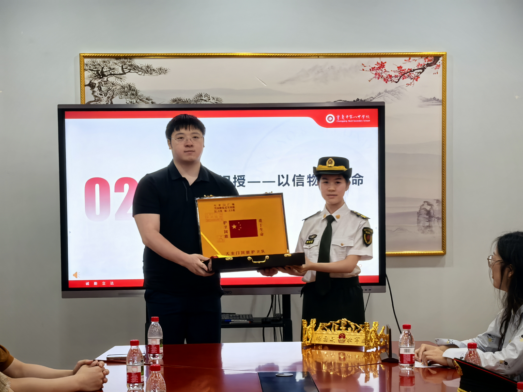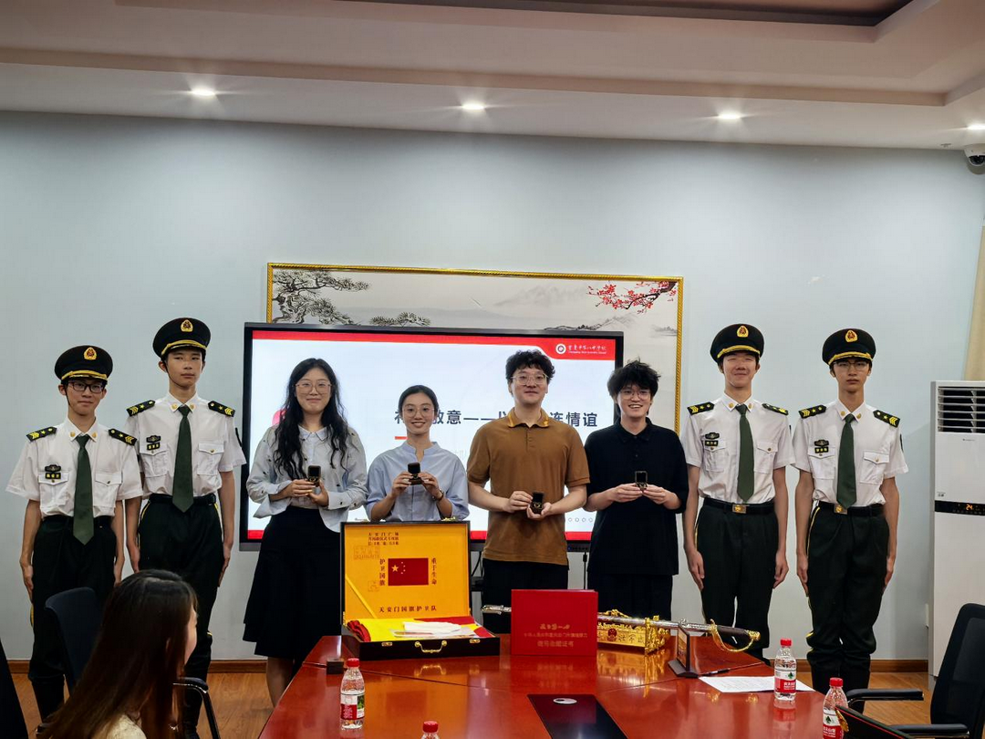 八位队员在队长发言结束后排好队列向学长学姐回赠以国旗仪仗队臂章为模型的勋章,礼虽小,情却深,这是对前辈的敬仰,是对共同目标的承诺,亦是护其信念和爱国精神的不断传承。