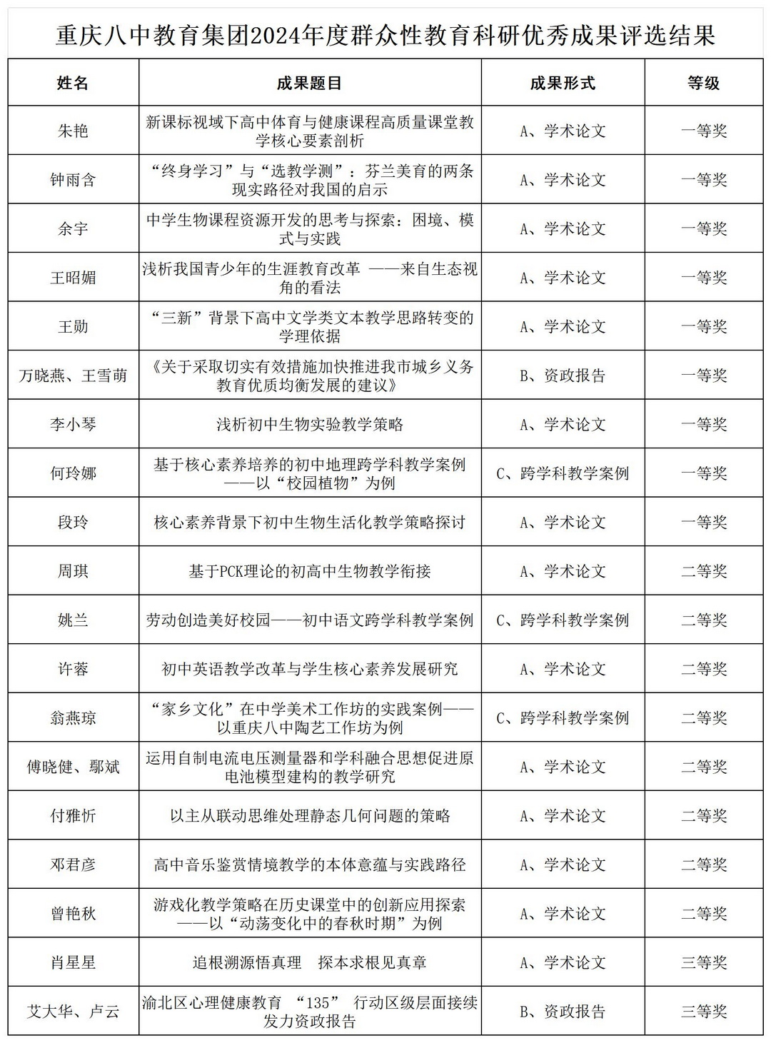 为充分展示教育改革发展的新实践、新成效,积极助力渝北区教育事业可持续发展,区教育学会组织开展了2024年度渝北区群众性教育科研优秀成果评奖工作。经专家严格评审、综合评定,评选结果已正式确定,现对获奖情况予以通报。