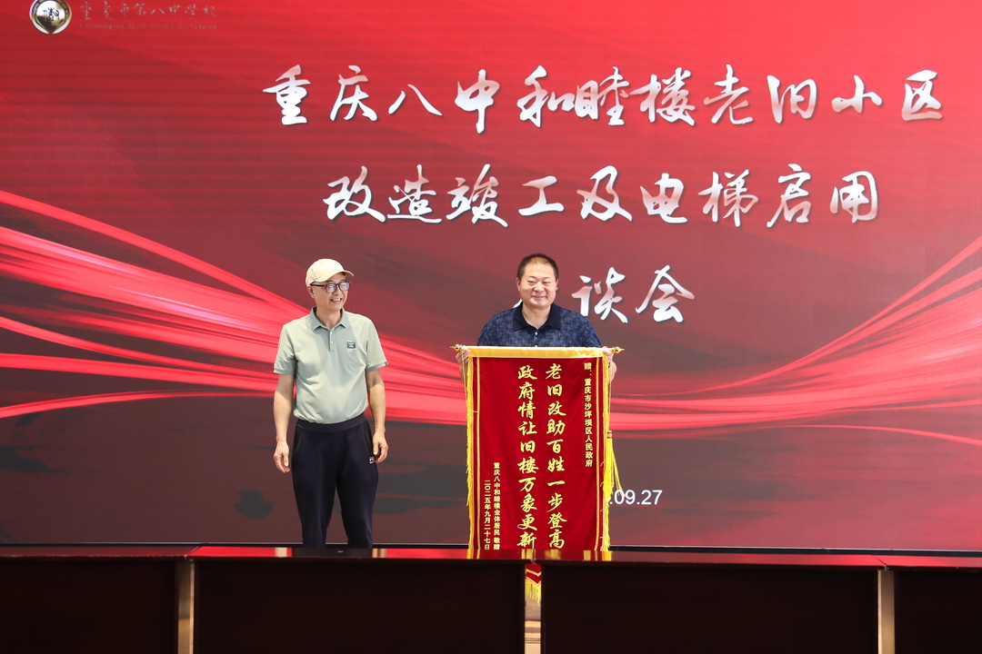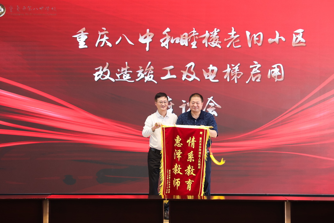 9月27日,重庆八中和睦楼老旧小区改造峻工及电梯启用座谈会在沙坪坝校区科技楼六楼报告厅隆重举行,现场同步开展钥匙交付与锦旗赠送仪式。出席现场的领导有沙坪坝区政府副区长钟文、区规资局局长沈艳丽、区城管局副局长程琼梅、区住建委副主任王亚威、区市民服务和营商环境促进中心主任陈波、小龙坎街道党工委书记江涛峰。出席本次活动的还有沙坪坝区财政局、市场监管局、嘉新社区相关领导,相关建设公司,和睦楼业主代表以及重庆八中党委书记周迎春、校长卿知人、副校长梅家烨、总务处主任赵呈学、行办副主任赵心怡。会议由卿知人校长主持。