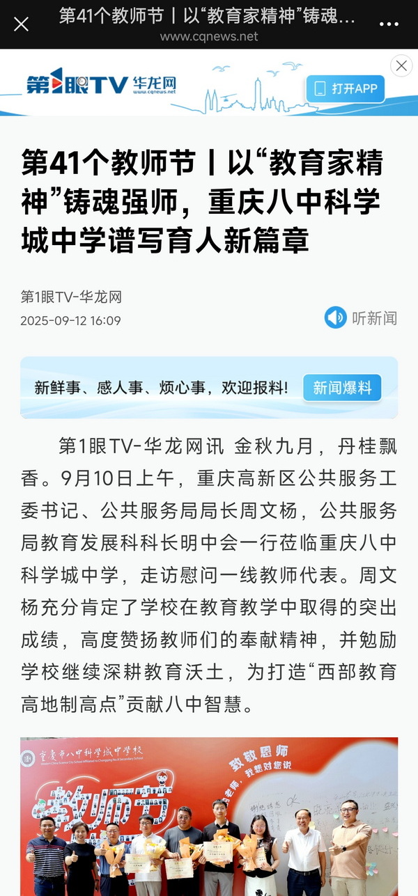第1眼tv-华龙网讯 金秋九月,丹桂飘香。9月10日上午,重庆高新区公共服务工委书记、公共服务局局长周文杨,公共服务局教育发展科科长明中会一行莅临重庆八中科学城中学,走访慰问一线教师代表。周文杨充分肯定了学校在教育教学中取得的突出成绩,高度赞扬教师们的奉献精神,并勉励学校继续深耕教育沃土,为打造“西部教育高地制高点”贡献八中智慧。
